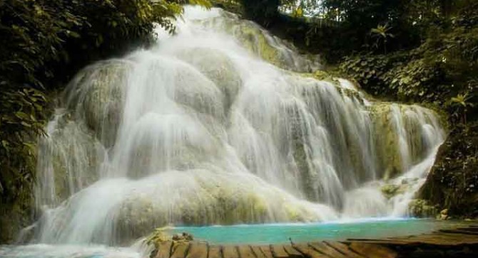 Jembatan-jembatan dari kayu dan bambu serta pohon-pohon Kelapa yang tinggi menjulang, menambah eksotis lokasi air terjun tersebut.