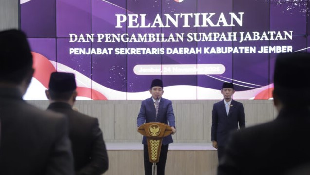 Jember, Bupati Jember Muhammad Fawait, S.E., M.Sc., resmi melantik Akhmad Helmi Luqman, S.Sos. sebagai Penjabat Sekretaris Daerah (Pj Sekda) Kabupaten Jember dalam prosesi pengambilan sumpah jabatan di Pendopo Wahyawibawagraha, Senin 24/11/2025.