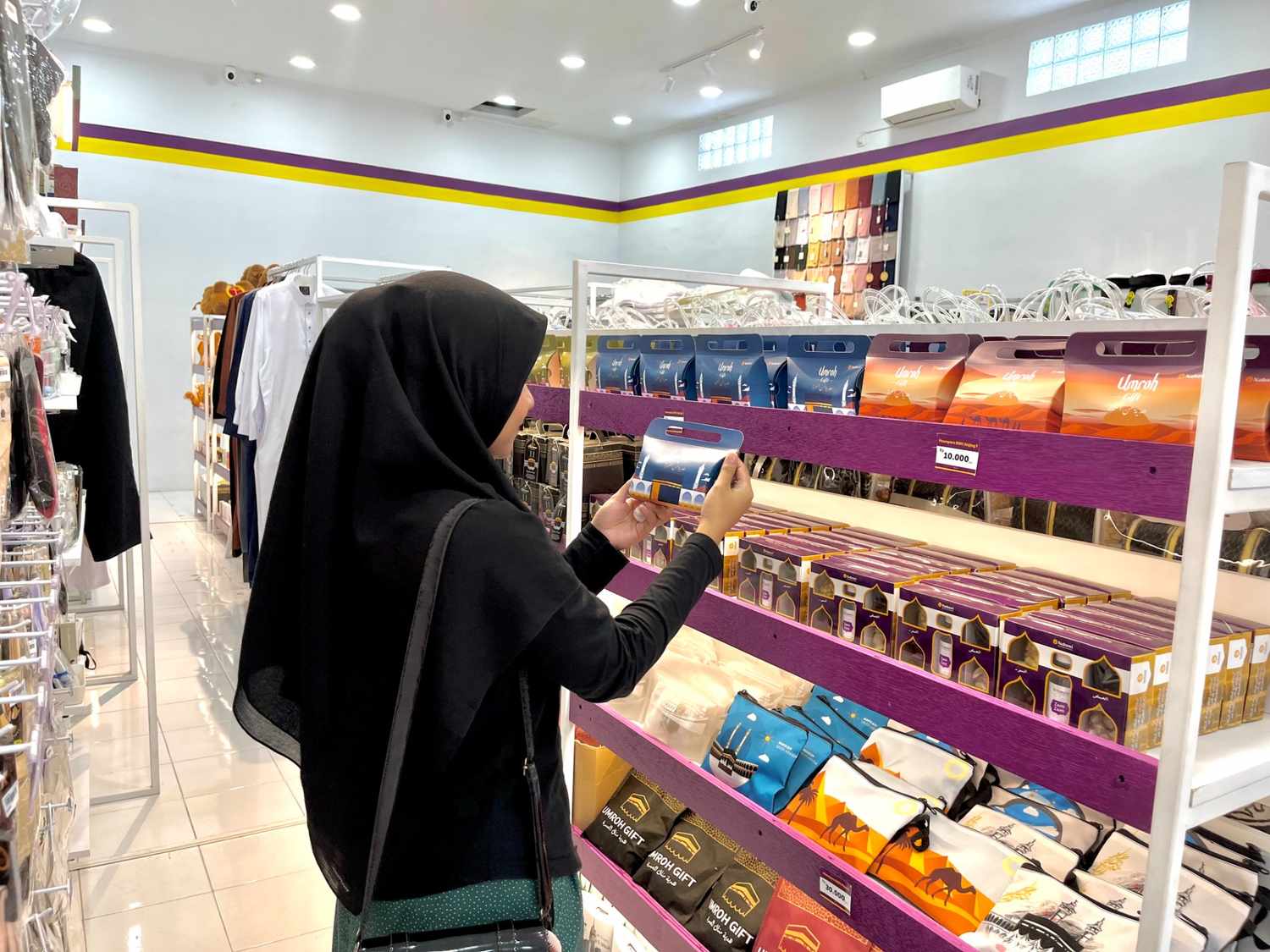 Pelanggan dapat dengan bebas memilih produk melalui rak-rak yang tertata rapi, mulai dari berbagai jenis kurma, air zam-zam, kismis, hingga perlengkapan ibadah seperti ihram dan mukena.
