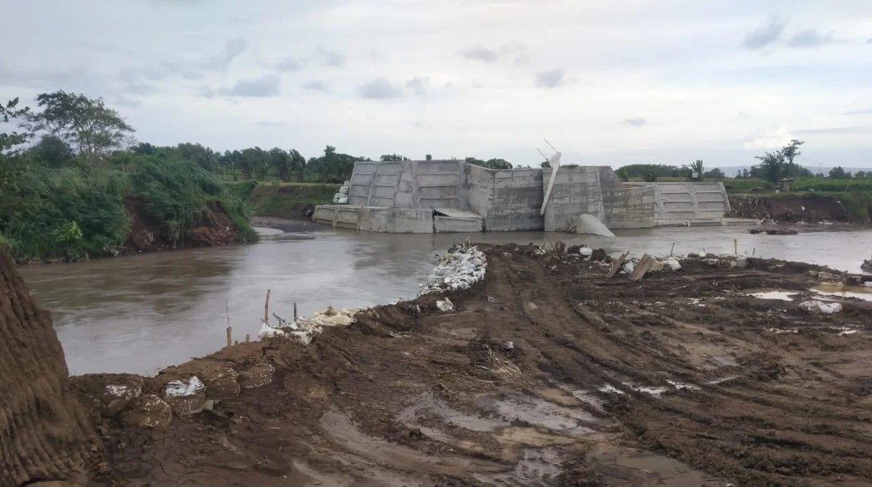 Selain bangunan utama, kisdam yang berfungsi sebagai penahan aliran air juga dilaporkan ambrol akibat tergerus derasnya arus sungai.