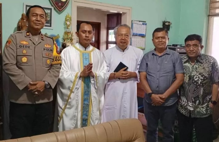 Kehadiran Wakapolres disambut hangat oleh Pemimpin Umat Katolik Romo RD Bonifasius Hudiono, didampingi Romo RD Agustinus Galuh Wicaksono, serta Ketua Panitia Natal 2025, Viktor Novan Haryanto dan Primus Segu.